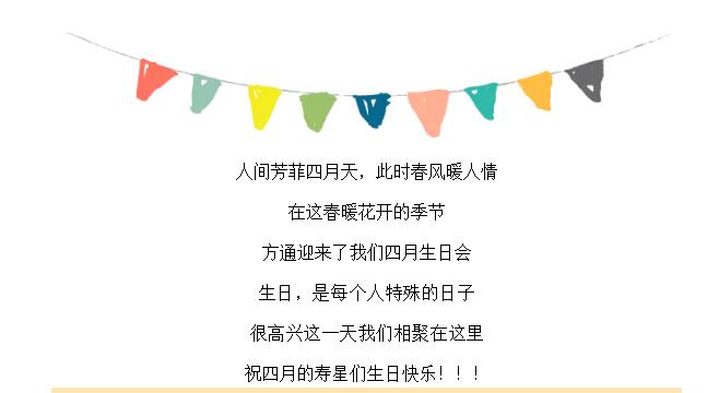 • 人間芳菲四月天,此時(shí)春風(fēng)暖人情在這春暖花開(kāi)的季節方通迎來(lái)了我們四月生日會(huì )生日,是每個(gè)人特殊的日子很高興這一天我們相聚在這里祝四月的壽星們生日快樂(lè )。!